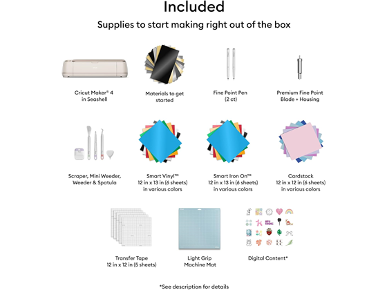 MAQUINA DE CORTE INTELIGENTE CRICUT MAKER 4 (KIT), PAQUETE CON PLANCHA INTELIGENTE 2,7 M, COLOR ROSA, SMART VINYL REMOVIBLE 90 CM, COLOR AGUAMARINA, KIT TRUE CONTROL COLOR MENTA, VINILO IMPRIMIBLE, TAPETE PARA MAQINA STANAR GRIP 30 X 30 CM (2 UNIDADES), TARJETAS INSERTABLES, MUESTRARIO SENSEI S40, 4,75 X 4,75¨ DE 35 UNIDADES, BOLIGRAFO DE PUNTA FINA 0,4 MM, RASPADOR, ESPATULA, LAPIZ DE PUNTUACION, MINI DESMALEZADORA,