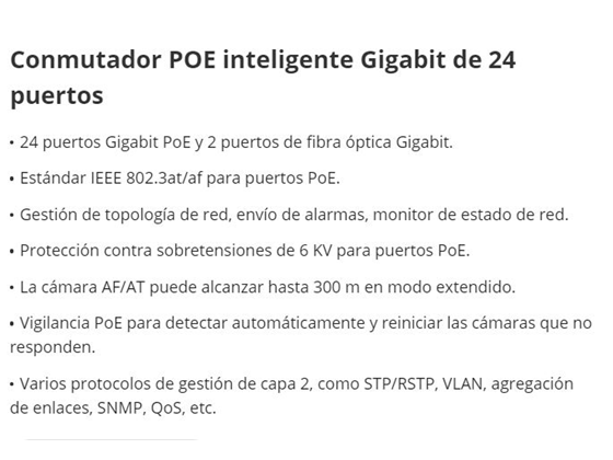 SWITCH 24 PUERTOS HIKVISION, 24 × GIGABIT POE, 300M (CAMARA),PROTOCOLOS DE GESTIÓN DE CAPA 2, (STP/RSTP, VLAN,SNMP, QOS), 2 PUERTOS SFP